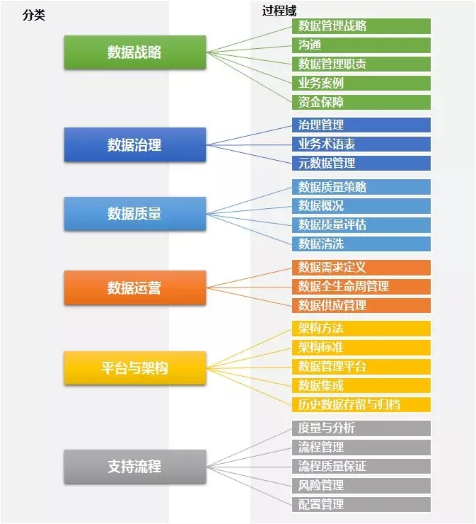 DMM模型包括25个过程域,由20个数据管理过程域和5个支持过程域组成,按管控维度不同分为:数据战略、数据治理、数据质量、数据运营、平台与架构、支撑流程6个类型,如下图所示: