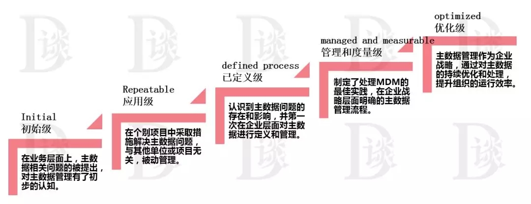 MD3M成熟度模型参考了COBIT(IT成熟度标准)、Oracle、DataFlux等已有模型,将主数据管理的成熟度划分为5级,如图: