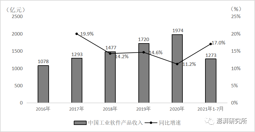 另据Gartner数据,2020年全球工业软件市场规模约为4332亿美元,约合人民币2.8万亿元,2020年中国工业软件产品实现收入1974亿元,照此计算,仅占全球份额的7%,表明中国工业软件实力明显偏弱。