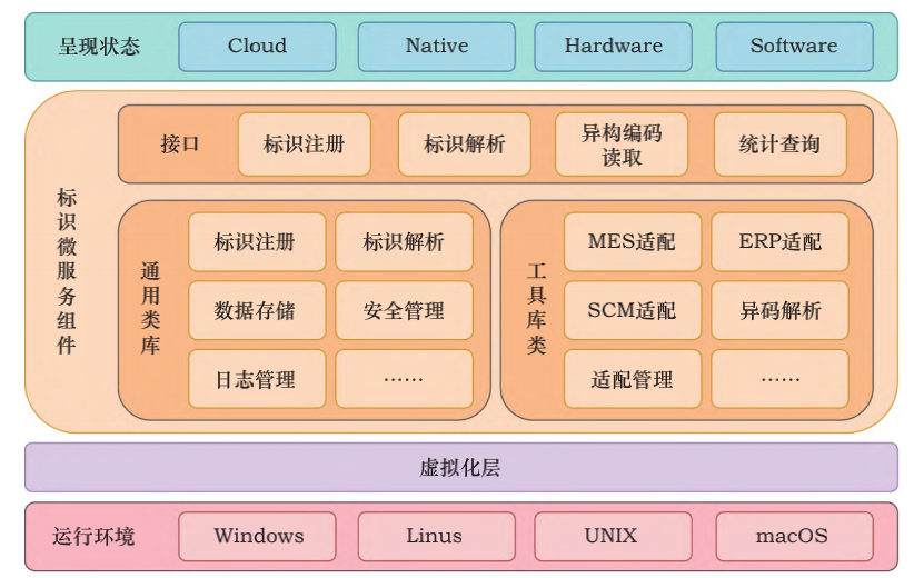 工业软件云平台由多个独立的微服务组成,每个微服务都有专属的业务逻辑和数据库,便于技术升级、应用灵活。云标识微服务通过集成来自边缘设备的标识数据,实现对设备消息的内容解析、过滤提取、重新整合;进而转发到后端服务,无缝连接云平台后端的存储组件、函数计算、大数据分析套件、工业软件应用,打破设备及工业软件之间的数据隔离。云标识微服务对海量工业标识进行统一解析,使用消息队列服务之上的 XML/JSON 等格式或者 RESTful Web 服务来实施风险管理、流程管理;将统计数据或必要信息传输到其他信息技术或操作技术系统,如 PLM、ERP、MES、SCM、仓储管理系统(WMS)等。