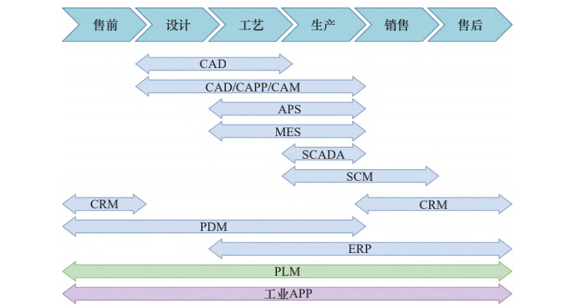 工业软件主要分为设计研发类工业软件,如计算机辅助设计(CAD)、计算机辅助工程(CAE)、计算机辅助制造(CAM)、计算机辅助工艺(CAPP)等;信息管理类工业软件,如产品生命周期管理(PLM)、企业资源计划(ERP)、生产执行系统(MES)等;工业控制类工业软件,如数据采集与监视控制系统(SCADA)、可编程逻辑控制单元(PLC)等。在工业产品的全生命周期内,需要多类工业软件的协同合作,因而跨软件的数据互操作极为重要。