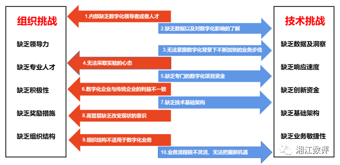 从以上数字化转型的五大误区我们不难看出,企业数字化转型面临着来自于组织于技术的两大挑战,来自组织的挑战包括: