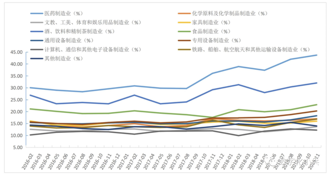 但众所周知,我国传统劳动密集型制造业由于原材料价格上涨、管理成本高、销售价格低,毛利率并不高。根据网络上流传较广的一份《2016-2018 年中国制造业细分行业毛利率变化情况对比图》来看,中国制造行业中最赚钱行业目前是医疗制造业,毛利率一路走高,从30%持续走高到40%;另外一个持续走高的行业是酒、饮料和精制茶制造业,毛利从25%持续走高到30%。