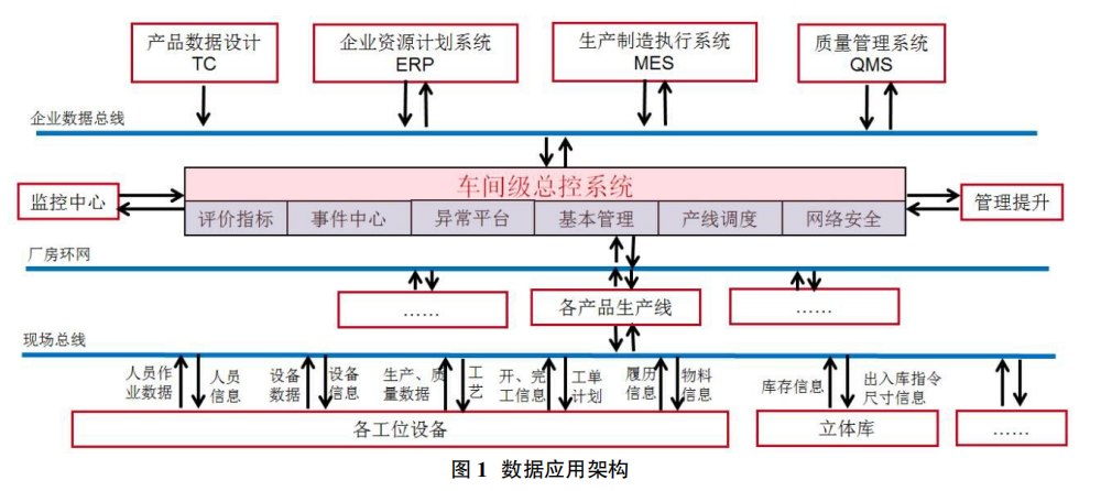 数字化工厂的基本特点是业务流与信息流的融合,一是从产品设计(产品数据管理系统TC)、资源配置(企业资源计划系统ERP)、制造执行(制造执行系统MES)及底层生产线的业务流全部实现数字化的格式实现和传递[2];二是从产品生产过程中生成并采集上来的各种数据可以回传归集,在管理平台上对数据进行分析,形成质量预警、管理问题的依据,用数据形成质量提升和管理改善的驱动力。以此为出发点,数字化工厂数据应用的架构为图1所示。