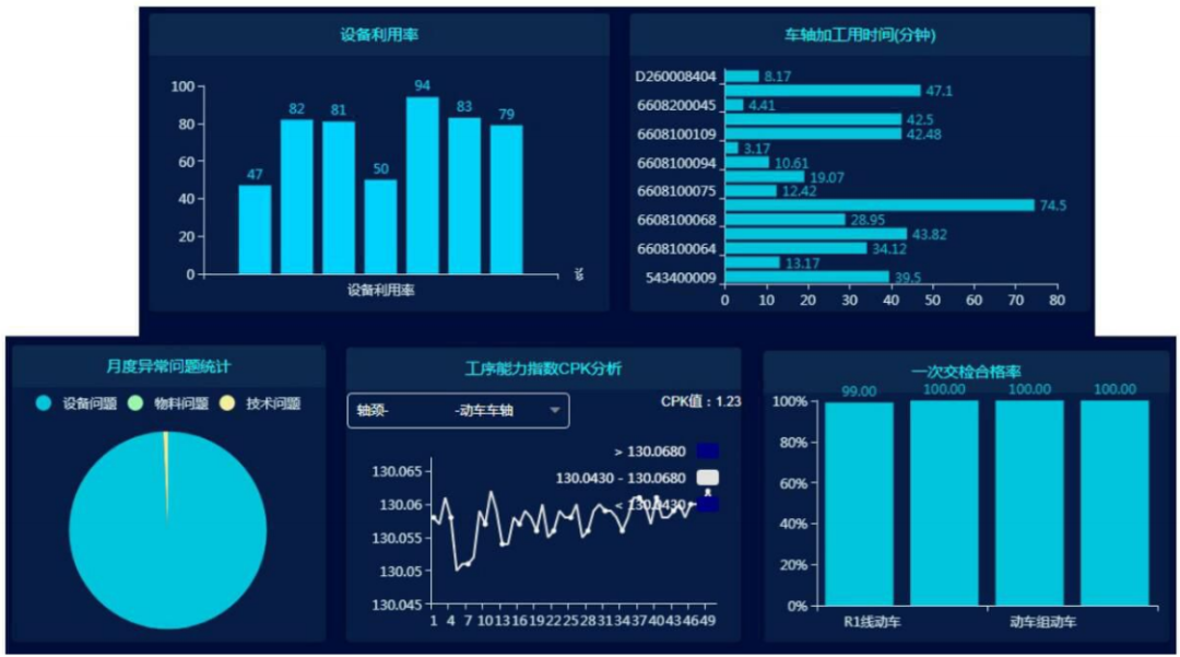 为满足工艺、生产、质量、设备和人员等管理需要,生产过程采集的数据需转化成管理语言才能使用,单纯的数据无法表达管理内涵和暴露问题。在基础数据收集上来以后,必须进行管理逻辑的处理,形成指标数据,如设备利用率、工位节拍等。(图5)