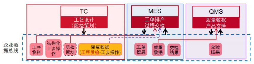 企业制造环节的数据源头是以产品构型为基础设计形成的工艺设计,质检策划要基于工艺设计进行检验信息的策划。工艺设计和质检策划数据包含的工艺流程、物料、工艺文件、检验要求等信息,以此为依据向ERP、MES、WMS、QMS等系统传输一整套统一的数据,作为指导生产的数据,以此保证数据流上下传送时,同一数据的共享和利用。作为企业规划的整体信息平台,企业数据总线要将各系统连接起来。(图3)