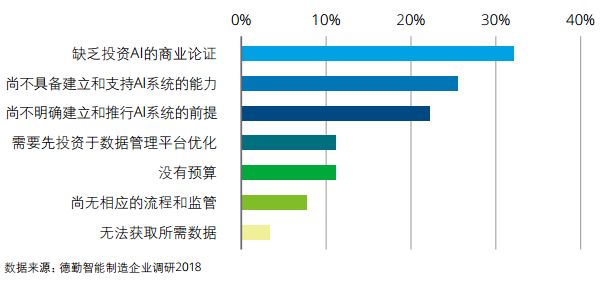 当然人工智能仍处在其发展早期,技术突破及商业论证需要更长时间。另外,人工智能应用环境和基础设施的完善程度,信息和安全法规、企业自身的能力都成为企业面临的主要挑战。我们发现,对于尚未部署人工智能的制造企业来说,缺乏投资人工智能的商业论证、尚不具备建立和支持人工智能的系统能力、尚不明确部署人工智能的前提为主要挑战(见下图)。