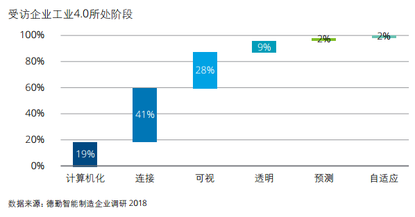 随着中国两化融合和工业物联网建设等多项举措推进,制造型企业数字化能力素质显著提升,大部分企业正致力于数据纵向集成。德勤调研结果显示,81%的受访企业已完成计算机化阶段,其中41% 处于连接阶段,28%处于可视阶段,9%处于透明阶段,而预测和自适应阶段的企业各自占2%。