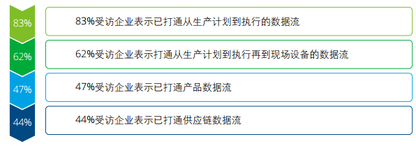 结果显示, 83%的受访企业表示已打通ERP和MES的数据流打通。62%的企业继续向 下打通MES到现场设备的数据流。但仅有47%的企业打通了产品数据流,44%的企业打通供应链数据流。而且考虑到我们调查的企业均为资质较好且为中等以上规模,这一系列比率显然高于中国整体平均水平。