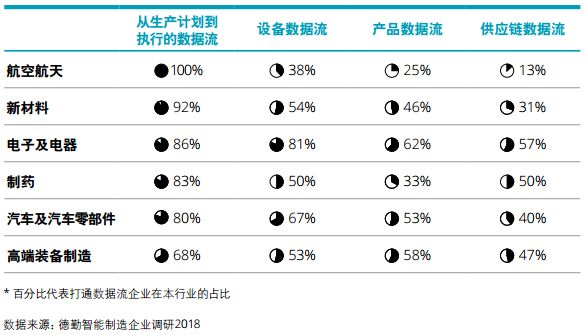从行业角度来看,航空航天领域全部受访企业已经打通从生产计划到执行的数据,但从生产执行到现场设备、产品以及供应链的数据链条连通相对滞后,提升空间大。电子组件及电器制造行业产品数据流 和供应链数据流连通情况高于其他行业,数字化工厂整体水平较高。产品质量可谓是制药行业的生命,而打通产品数据流的制药企业仅占33%,行业需要强化产品全生命周期可追溯,提升产品质量管控能力。汽车及汽车零部件以及高端装备制造都在产品数据流方面领先(见下图)。