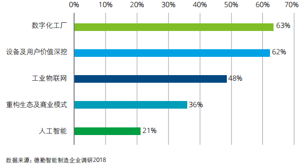 德勤调查发现,中国工业企业智能制造五大部署重点依次为:数字化工厂(63%)、设备及用户价值深挖(62%)、工业物联网(48%)、重构商业模式(36%)以及人工智能(21%)。