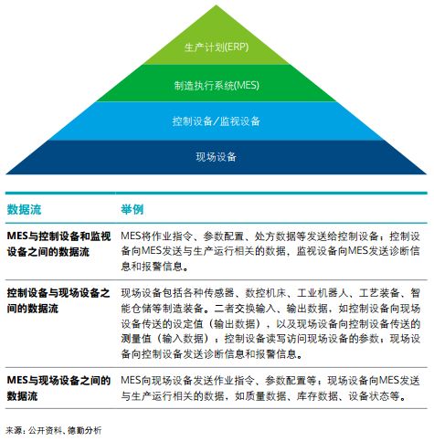 德勤调研结果显示,目前企业致力于打通从ERP到MES乃至现场设备的数据流,但这也仅是从生产到执行的打通,未来 还需将产品数据、供应链数据串联。我们将生产数据流分为两个环节:一、打通生产计划与执行系统的数据流;二、执行与监控和现场设备的数据流。