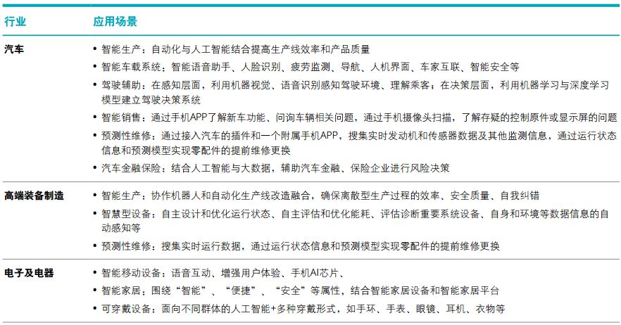 人工智能正迅速渗透各行各业。汽车及汽车零部件制造、高端装备制造、电子及电器制造三个行业在制造流程中采用机器人的比例过半。汽车及零部件制造行业使用机器人的企业比例达到80%,预示未来工业机器人的市场增量将主要来自非汽车行业。在产品和服务领域已 经或计划部署人工智能的行业分布比较均匀,高端装备制造和制药比例较高,但其他行业如新材料、汽车及零部件、航空航天、电子及电器也正在或计划部署人工智能。