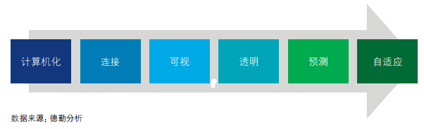 企业数字化能力素质体现在其利用数据指导生产以及系统自优化的能力。我们借鉴国际普遍认可的工业4.0发展路径,将企业智能化成熟度分为六个阶段:计算机化、连接、可视、透明、预测和自适应。