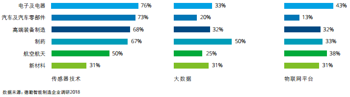 从行业应用来看,电子及电器行业传感 器和平台应用最为普及,76%的受访企业利用传感器采集数据,43%的企业利用物联网平台,但仅有33%的企业采用大数据技术分析所采集的数据。汽车及零部件制造行业传感器技术应用也有较高普及率达73%,但大数据和平台应用低于其他受访行业。制药行业大数据技术利用最为积极,因为医药行业早已面临海量数据和非结构化数据挑战(见下图)。