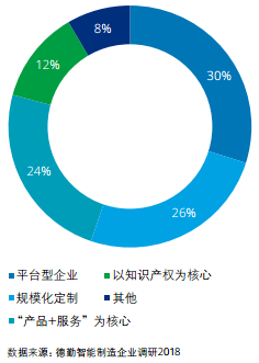 德勤调研发现企业对未来商业模式的规划大致呈四类:30%的受访企业未来商业模式将以平台为核心,26%的企业走规模化定制模式,24%以“产品+服务”为核心向解决方案商转型,12%以知识产权为核心(见下图)。平台型商业模式定位以提供多种软件服务和搭建生态系统为核心,未来可能不会出现类似BAT这样的行业巨头,但不乏垂直行业领军企业或平台。规模化定制模式,如C2M已经不局限于服装制造,而延伸到汽车和装备制造等行业。“产品+服务”为核心旨在围绕客户需求提供解决方案,是目前很多企业在做的。以知识产权为核心的企业往往通过专利战略,形成技术壁垒占领市场。
