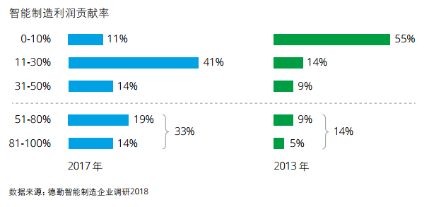 2013年智能制造为企业带来的利润并不明显,55%的受访企业其智能制造产品和服务净利润贡献率处于0-10%的区间,而2017年,仅有11%的受访企业处于这个区间,而41%的企业其智能制造利润贡献率在11-30%之间。利润贡献率超过50%的企业,由2013年受访企业占比14%提升到2017年的33%。智能制造利润贡献率明显提升,利润来源包括生产过程中效率的提升和产品服务价值的提升。