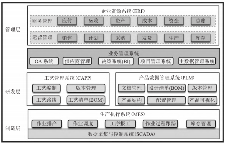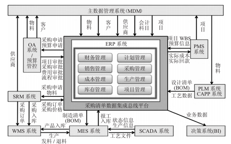 在企业管理层面,部署企业资源管理系统(ERP)和其它业务信息系统。ERP系统以实现精益生产制造为目标,依据客户的个性化需求订单,制定物料采购计划和主生产计划,按计划完成采购、制造、库存及销售过程,整合集成管理企业资金流、物流和信息流,为企业提供实时、准确、完整的信息。协同办公系统(OA)主要包括任务管理、公文管理、档案管理、通知公告等管理模块,在数字化平台中承担工作流审批以及与报表工具相结合实现决策分析等功能。供应商关系管理系统(SRM)在线实现供应商管理、采购订单下达、采购合同签订、物流发货、质量检验等供应链中各环节管控。项目管理系统基于项目运行业务流程,实现项目从立项、预算、执行、监管、验收等全过程管控,以及项目运行过程中风险、变更管理。主数据管理系统保证业务数据的一致性、准确性和完整性,为多系统业务集成提供统一的数据源和标准,包括数据标准制定、管理流程设计、数据分类及清理等功能。