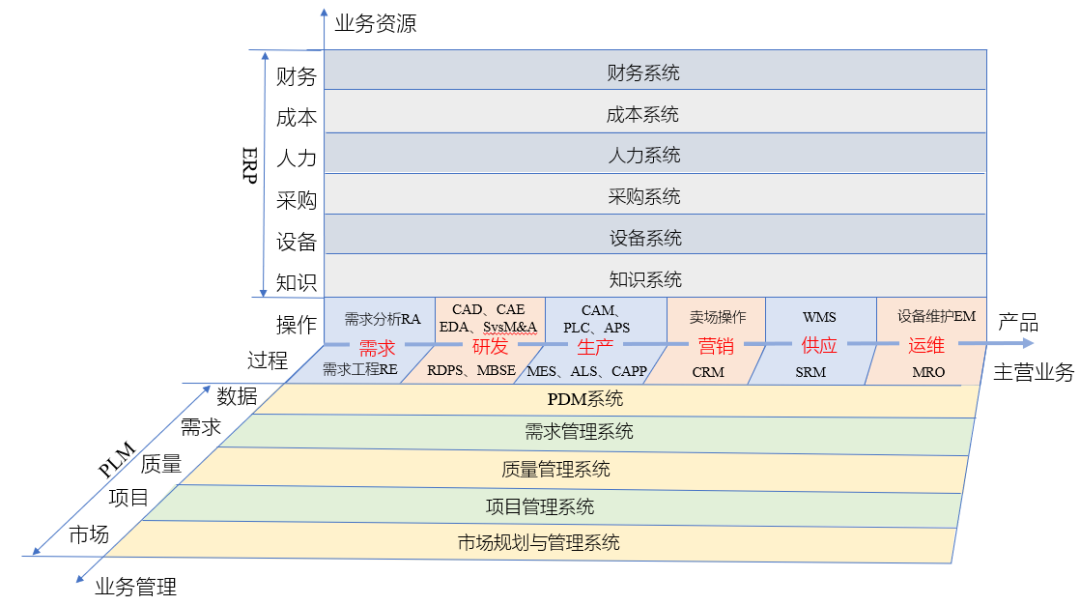中间水平轴是主营业务,另一水平轴是业务管理(PLM),垂直轴是业务资源(ERP),本图更真实地反映了企业的业务结构。据此,形成立体化的数字技术图谱。
