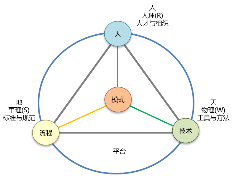 该模型从模式、组织、技术、流程以及平台几个方面对体系进行分析。模式是中心,组织、技术、流程围绕模式展开,平台是模式实现和体系落地的支撑和载体。由此构成“1-3-1”结构模型: