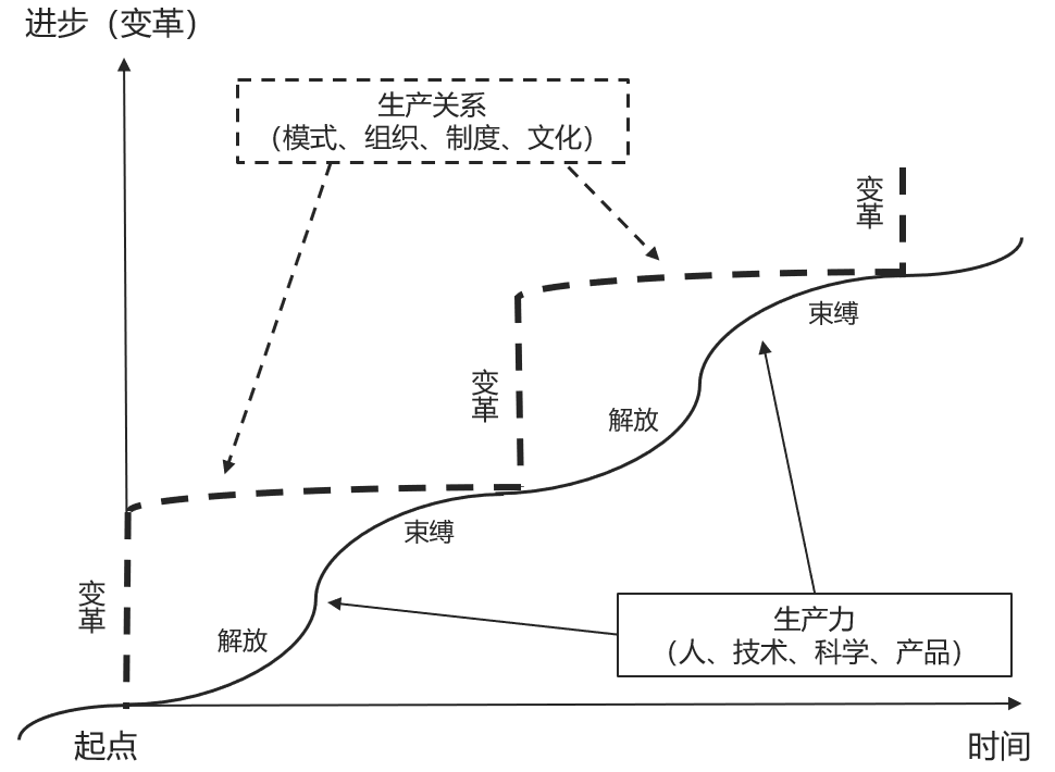 本文不赘述哲学和经济学原文,只用图1来直观和简单地说明生产力和生产关系的关系。生产力是推动社会发展的主要动力,会持续不停发展,直到生产关系开始束缚生产力的发展,使其进步缓慢。但生产力的发展是不可阻挡的,所以终将突破枷锁,也就是说,生产关系将发生一次变革,建立一种不束缚生产力发展的关系。每次变革结束,生产力会得到解放,逐步恢复发展速度,直到下一次束缚的到来。