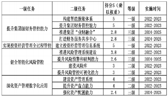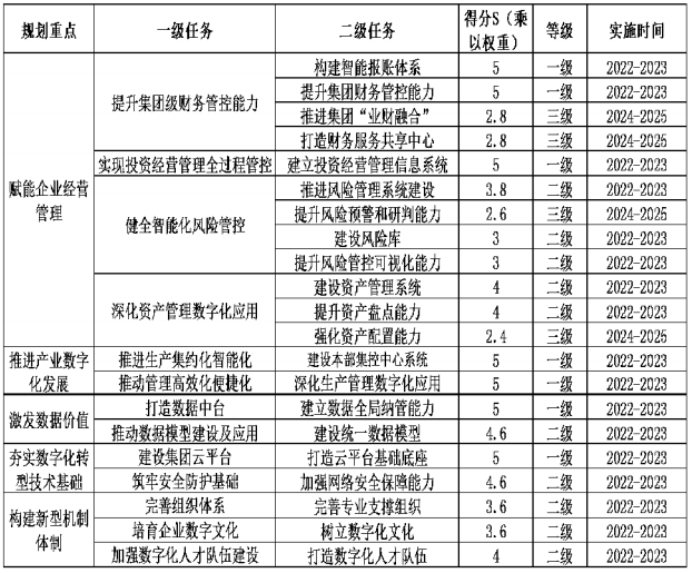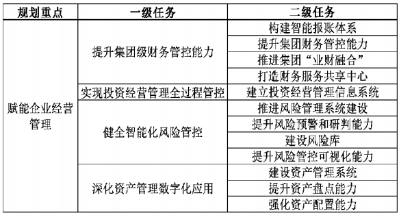 根据集团数字化转型工作总体框架,涉及赋能企业经营管理、推进产业数字化发展、激发数据价值、夯实数字化转型技术基础、构建新型机制体制等五大规划重点方向,通过问卷调研、现场访谈、问题分析等方式,在每个大方向下又细分了一级任务与二级任务。以“赋能企业经营管理”为例,包含4项一级任务:提升集团级财务管控能力、实现投资经营管理全过程管控、健全智能化风险管控、深化资产管理数字化应用,共涉及12项二级任务,如下表所示。