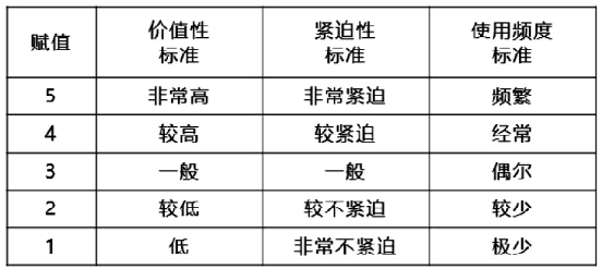针对价值性(V)、紧迫性(U)和使用频次(F)三个评价指标按1~5分设置赋值标准,评价指标赋值标准如下图所示: