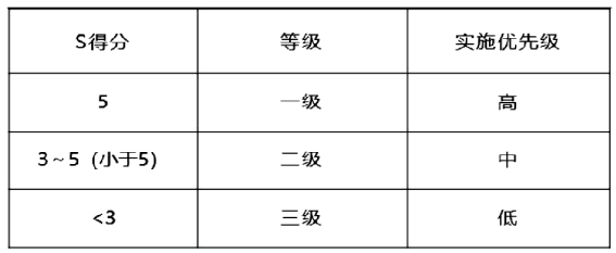 根据S的分值判断各项任务的实施级别,S=5时,表示该项任务的价值性、紧迫性、使用频次相对较高,任务等级为一级,实施优先级最大;3≤S<5时,表示该项任务的价值性、紧迫性、使用频次相对一般,任务等级为二级,实施优先级一般;S小于3时,表示该项任务的价值性、紧迫性、使用频次相对较低,任务等级为三级,实施优先级较低。