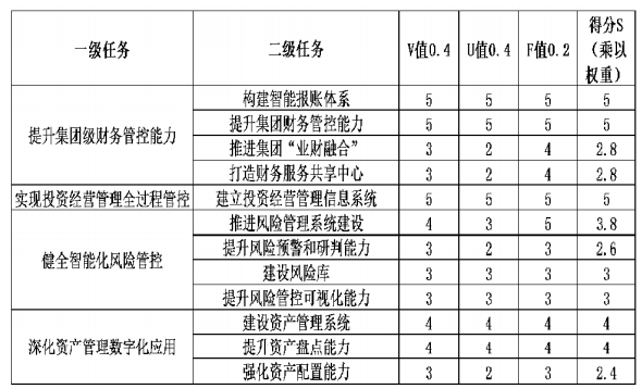 针对每项具体任务,设立价值性(V)、紧迫性(U)和使用频次(F)三个评价指标,设立不同权重,根据行业经验及企业实际情况,将三个评价指标的权值分别设为fV=0.4、fU=0.4、fF=0.2(权值和为1),选取企业一把手、分管领导、关键岗位工作人员、行业专家等组成专家小组,采用专家打分法,根据每个指标的重要性,按1~5分进行评分,按S具体业务=fV×V+fU×U+fF×F计算出每项任务的分值S,得出数字化转型任务评分表,如下表所示。