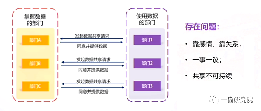 还有就是靠感情、靠关系的方式,比如两个部门的领导是党校同学,有时候要用数据就可以直接拿到了。但这种靠感情看关系的实现机制很不稳定,如果出现领导变更了,可能就拿不到数据了,这就会影响数据共享的可持续性。