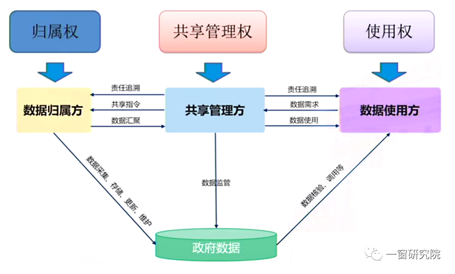 以上,基于这三方权力的确认,就比较容易建立起一种数据共享使用中的可信机制,我们把这套机制称为叫基于“三权分置”的跨部门数据共享模式。