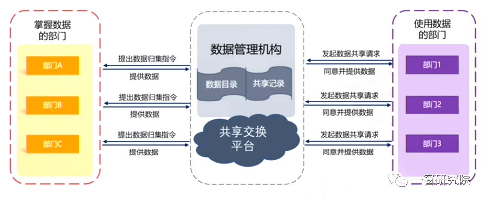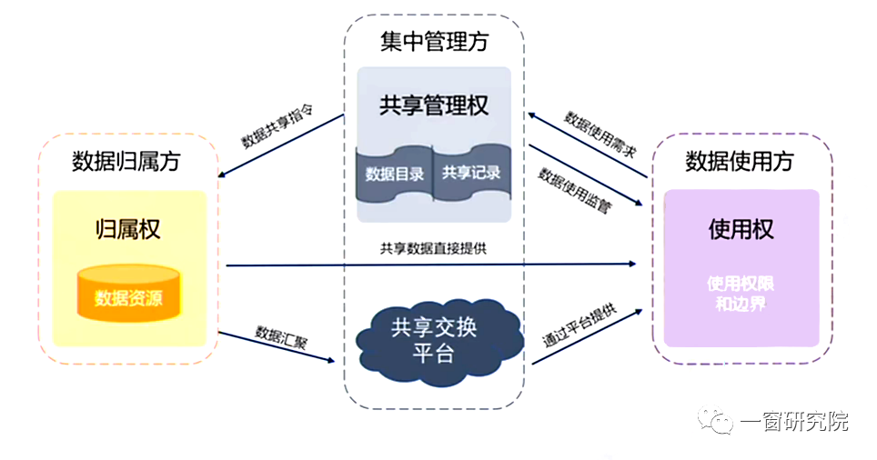 如下图,我们通常说数据共享使用涉及到三个方面:①数据的拥有方或叫归属方;②数据的使用方;③对数据平台行使管理职能的管理方。