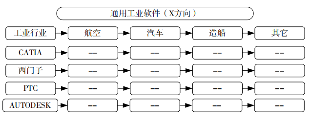 应用软件从信息管理发展到研发设计、生产控制、嵌入式软件等。本文倡导工业软件新生态,将专业软件发展为通用软件,面向航空、汽车、造船等不同行业。例如CATIA、西门子、PTC或AUTODESK,可同时应用于航空、汽车、造船、建筑等行业,如图5所示。