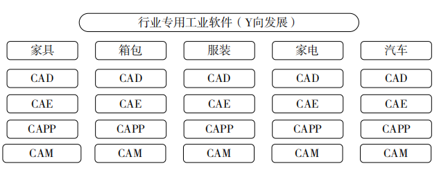 全世界工业软件龙头企业基本选择通用工业软件发展路线,从人类分工到计算机架构分工,再到系统软件分工。中国的工业软件企业可针对较为完整的工业体系行业,例如家具、箱包、服装、家电和汽车等,开发专用设计、仿真、工艺和制造软件,集中优势研发,与现有成熟工业软件相互结合,如图6所示。