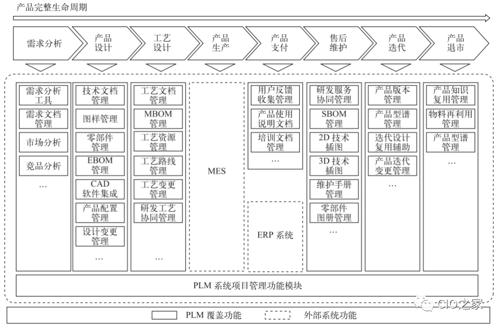 产品生命周期管理系统 (Production Life-cycle Management,PLM) 是传统产品信息管理系统 (ProductData Management,PDM)在功能上的延伸。其与企业资源管理系统 (Enterprise Resource Planning,ERP)一样是企业数字化转型中的重要支柱,区别在于,PLM 管理的对象是所有与产品相关的数据,其管理涵盖产品的整个生命周期,其中不仅包括图样、BOM 和生产工艺等,还囊括了需求管理、产品供应链管理、产品售后维护和项目管理等,其具体功能结构如图2所示。