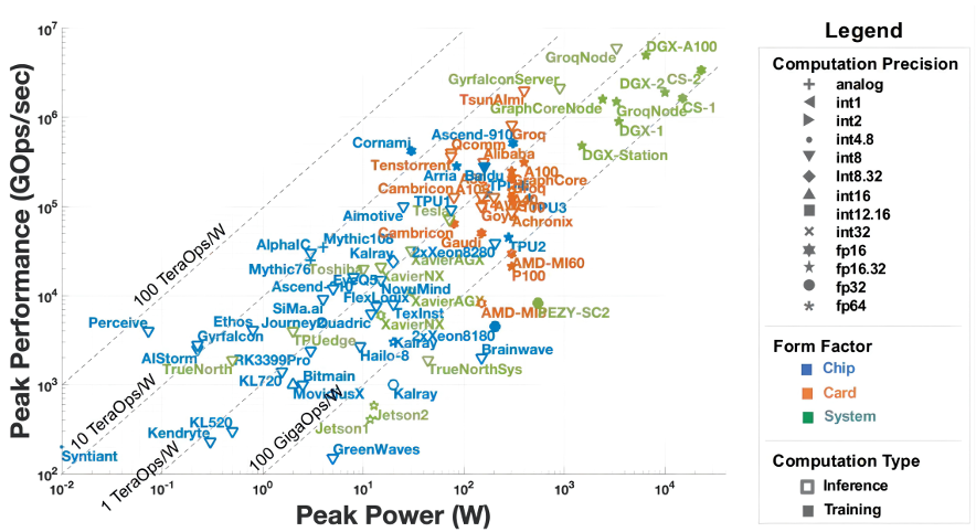 △图11:公开发布的 AI 加速器和处理器的峰值性能与功耗散点图