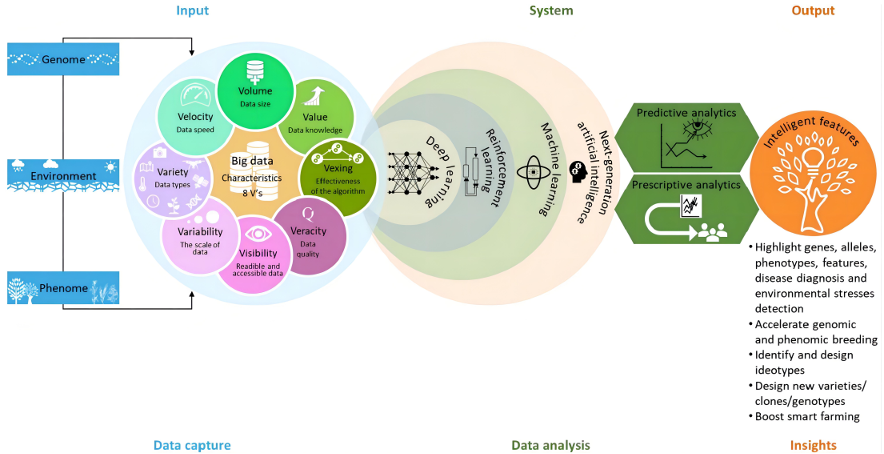 随着大数据和AI技术使用的增长,作物育种开始进行融合与突破(图19)。AI技术可以支持服务的创建、模型的识别以及农业食品应用和供应链阶段的决策过程。AI在农业中的主要目标是准确预测结果并提高产量,同时最大限度地减少资源使用。因此,AI工具提供的算法可以评估产量,预测难以预见的问题或事件以及发生趋势。从种植到收获再到销售,AI促进了整个农业价值链。
