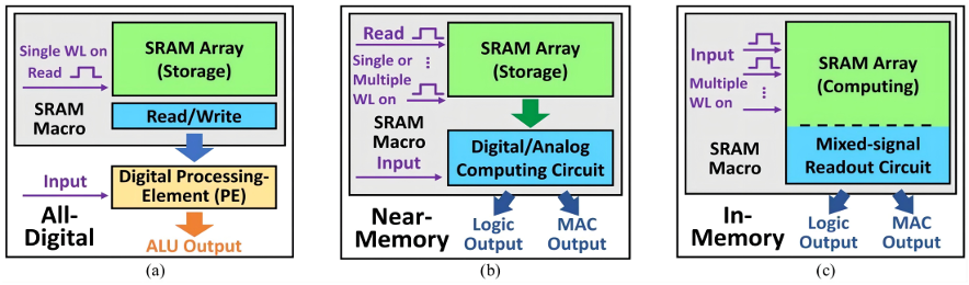 △图12:计算的三种概念方法:(a)传统数字计算,(b)近内存阵列计算(NMAC)和(c)内存阵列计算(IMAC)