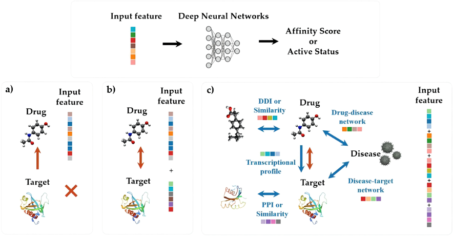 △图18:不同的基于深度学习的药物-靶点相互作用预测算法对应不同的输入特征。(a)基于配体的方法,(b)基于结构的方法,和(c)基于关系的方法