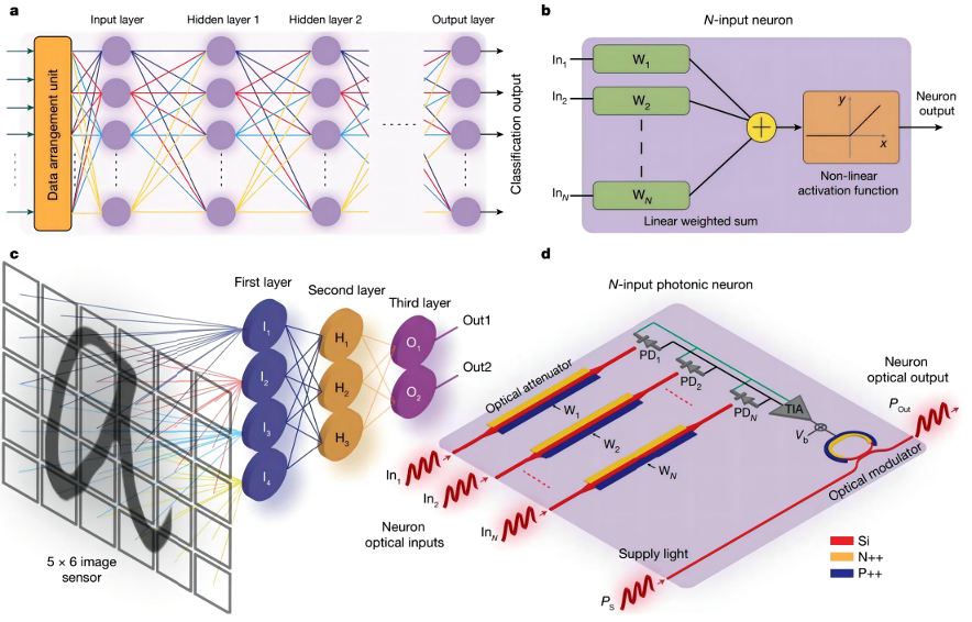 光子计算(图15)与电神经网络相比具有许多优势,包括超高带宽、快速计算速度和高并行性,所有这些都是通过使用光子硬件加速来计算复杂的矩阵向量乘法来实现的;