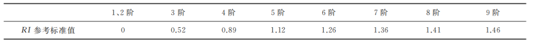 当一致性指标计算结果CR<0.1时,可以认为构建判断矩阵具有满意的一致性,否则需要专家重新判断评分。RI为平均随机一致性指标标准值,其参考值如表4所示。