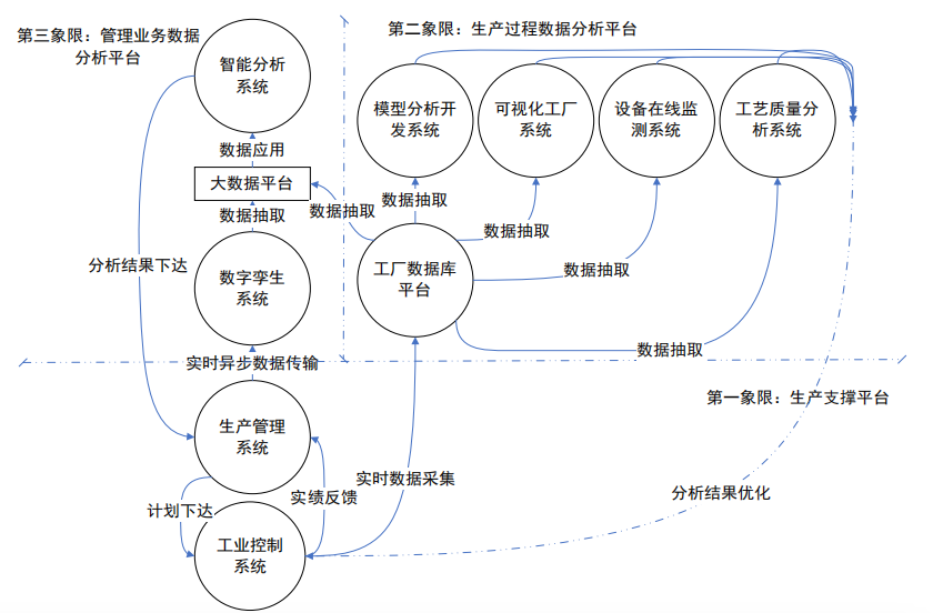 第二象限为生产过程数据分析平台,主要包括工厂数据库系统、模型分析研发系统、工厂可视化系统、设备在线监测系统、能源环保监测系统、工艺质量分析系统等。这个平台主要分析和处理的是企业产线在生产过程中产生的数据,在采集、分析和处理这些数据的同时必须尽量减轻产线系统的负荷,保护产线各系统安全。