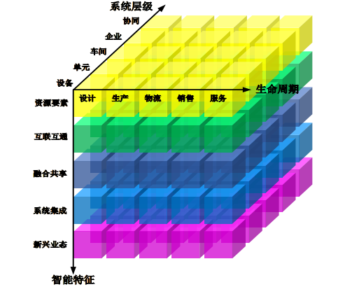 在工业和信息化部、国家标准化管理委员会共同组织制定了《国家智能制造标准体系建设指南(2021版)》中对智能制造系统架构从生命周期、系统层级和智能特征等3个维度所涉及的要素、装备、活动等内容进行描述,主要用于明确智能制造的标准化对象和范围。智能制造系统架构如图1所示。