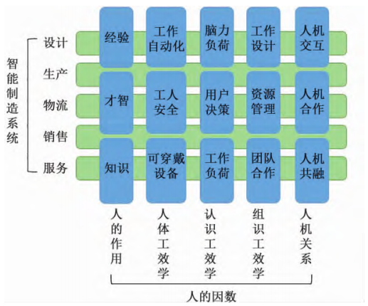 从智能制造全生命周期的角度出发,结合人所担任的角色,可以看出智能制造的不同环节均需考虑人的因素,这包括人的作用、人体工效学、认知工效学、组织工效学、人机关系等(图4)。国内外学者对人在制造系统中的关键地位、决定性作用进行了分析,梳理了制造系统中的人的因素及相关研究,认为先进技术只有真正和人协同起来才能充分发挥作用,进而真正带来智能化生产的效益。