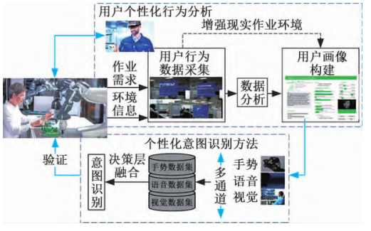 虚实环境与多模态人机交互技术的结合为实现智能化生产车间的智能人机融合提供了技术路径。微软发布的HoLoLen2增强现实头戴式设备支持手势、语音、眼动等交互方式,通过示教系统可用于复杂产品生产车间,辅助员工完成装配培训,并看使用Dynamic 365 Layout验证生产布局。目前,针对人与虚拟信息的自然交互方式的研究还不成熟,在利用增强现实设备完成操作的过程中,出现了许多人因问题。由于用户体验的差异性和多样性,以及用户认知能力的不同,当前的技术及相关产品无法以人们所习惯的方式与人们进行信息交流、提供主动服务,不能满足人机交互系统个性化、柔性化的要求。为提升用户体验,将多模态自然交互与用户画像相结合,深度挖掘用户的需求和意图,真正实现用户行为的个性化识别和理解,缩小人机交互的评估鸿沟,促进“以人为本”的智能制造发展。FANG等面向制造业装配场景,将增强现实作为媒介连接人和机器人,实现人机的多模态交互,并基于该系统,提出一种增强现实环境下的个性化人机协作装配意图识别方法(图9),针对用户在典型人机协作装配过程的物理行为习惯及特征,以单个用户为中心采集多维度、强相关的数据,构建用户画像模型,构建基于用户行为习惯的多模态特征融合方法模型,并对增强现实环境下的习惯手势、语音和视觉等物理行为进行识别,利用基于改进HMM和贝叶斯融合的决策层融合方法,实现面向不同用户的个性化意图识别,为用户提供更精准的个性化服务,有效改善人机协作过程中的用户体验。