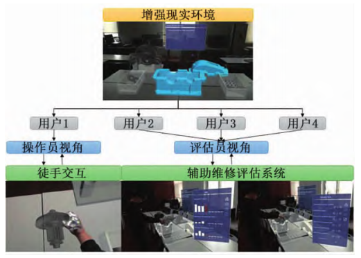 WANG等基于AR协同环境、碰撞检测、辅助评估工具等建立了AR装配工艺方案的评估系统,辅助工人从多个视角有效评估和改进装配过程(图6)。面向某汽车制造企业线束卡接等手工装配作业,WANG等设计了基于AR的手部作业检验软件,该软件包括AR测试场景构建、手势追踪与验证、虚拟模型操纵、碰撞检测等4个模块,可验证操作人员手部的通过性和可达性,解决了当前基于CATIA的人机仿真模块验证方法存在的人手定义复杂度高、真实性差等问题。