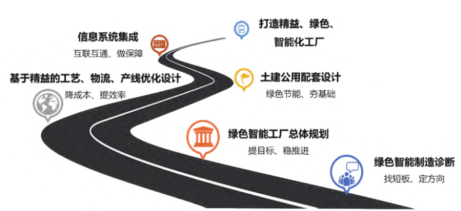 一条相对合适的实施路径是在诊断和总体规划的基础上,进行精益工艺布局优化,智能仓储物流的有序衔接和自动化的提升,同时辅之以绿色低碳的设施和手段,最后进行信息系统的实施和整体集成,从而实现整个工厂的智能化生产、低碳化运营。如图 2 所示。